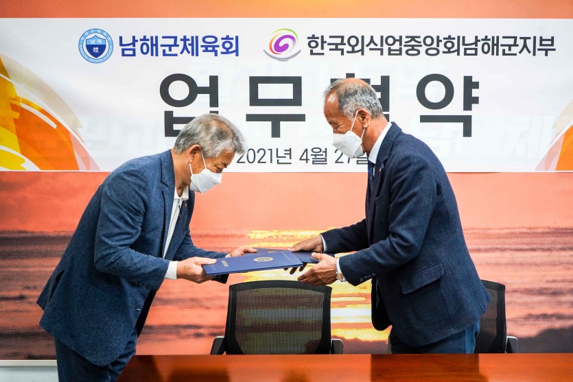 남해군 체육회 박규진 회장과 한국외식업 중앙회 남해군 지부 김윤상 지부장이 지난 27일 남해군체육회에서 남해군 체육회와 한국외식업 중앙회 남해군 지부가 전국 규모의 체육행사 유치 개최로 남해군을 방문하는 선수 및 참가자에게 친절하고 깨끗한 외식 서비스 제공으로 남해군의 발전을 위하여 상호 협력함을 목적으로 하고 남해군의 지역 경제 활성화와 선진 외식문화 향상을 위하여 남해군 체육회 이상록 상임부회장과 박도영 실무부회장, 정상규 사무국장 그리고 한국외식업 중앙회 남해군 지부 신충옥 부지부장과 곽정근 사무국장이 참석한 자리에서 협약을 체결 하였습니다.