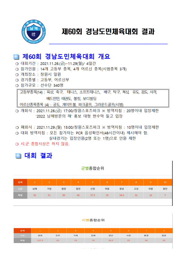 제60회 경남도민체육대회 결과 보고 페이지 정보 작성자 남해군체육회 댓글 0건 조회 813회 작성일 21-11-28 16:32 본문 제60회 경남도민체육대회 결과보고 목록 이전글제61회 경상남도민체육대회 개최일정 및 제62회 ~제63회 경상남도민체육대회 개최지 안내 22.01.12 다음글제60회 경남도민체육대회 결의 동영상 21.11.25 댓글목록 댓글목록 등록된 댓글이 없습니다.