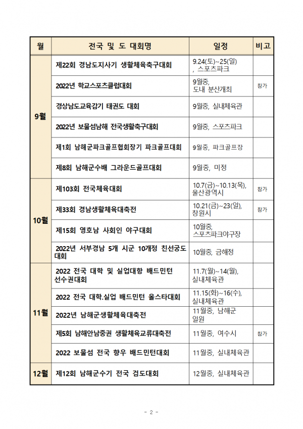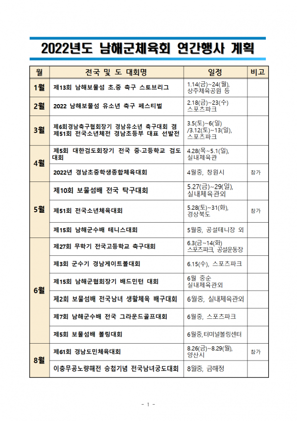 2022년 남해군체육회 연간계획 페이지 정보 작성자 남해군체육회 댓글 0건 조회 1,095회 작성일 22-03-14 12:01 본문 2022년 남해군체육회 연간계획입니다. 목록 이전글제5회 대한검도회장기 전국 중.고등학교 검도대회 22.04.19 다음글2022 남해보물섬유소년축구페스티벌 대진추첨 22.02.09 댓글목록 댓글목록 등록된 댓글이 없습니다.