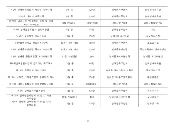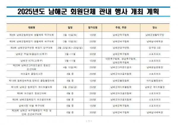 2025년 회원종목단체 관내 대회 일정 페이지 정보 작성자 남해군체육회 댓글 0건 조회 606회 작성일 25-03-04 09:42 본문 2025년 남해군체육회 회원종목단체 관내 대회 일정 목록 이전글2026년 남해군 회원종목단체 관내 대회 일정 26.03.16 다음글2023년 남해군체육회 회원단체 관내 대회 개최 계획 23.03.03 댓글목록 댓글목록 등록된 댓글이 없습니다.
