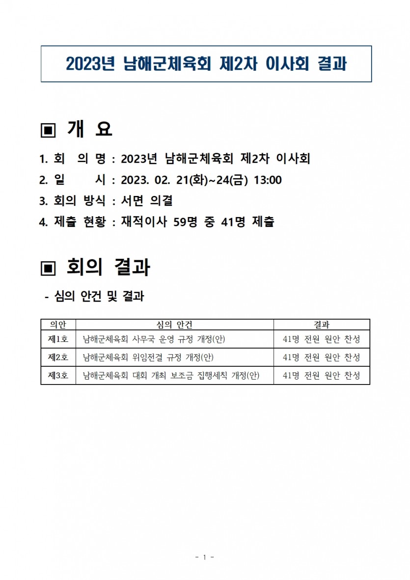 제2차 이사회 회의 자료 페이지 정보 작성자 남해군체육회 댓글 0건 조회 948회 작성일 23-02-21 09:03 본문 2023년 남해군체육회 제2차 이사회 첨부파일 회의서류.hwp (234.0K) 29회 다운로드 | DATE : 2023-02-21 10:29:15 의결서.hwp (47.0K) 20회 다운로드 | DATE : 2023-02-21 10:29:15 목록 이전글2024년도 남해군체육회 제1차 이사회 자료 24.02.06 다음글2023년 남해군체육회 제1차 이사회 자료 23.02.02 댓글목록 댓글목록 등록된 댓글이 없습니다.