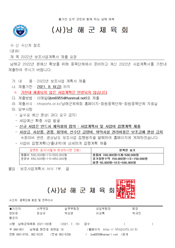 2022년 보조사업 계획서 서식 페이지 정보 작성자 남해군체육회 댓글 0건 조회 1,222회 작성일 21-07-16 14:09 본문 2022년 사업계획서 첨부파일 서식.hwp (32.0K) 79회 다운로드 | DATE : 2021-07-16 14:09:06 목록 이전글회원단체 대회참가 지원 요청 관련 서류 22.03.22 다음글회원종목단체 클럽현황 양식 21.03.30 댓글목록 댓글목록 등록된 댓글이 없습니다.