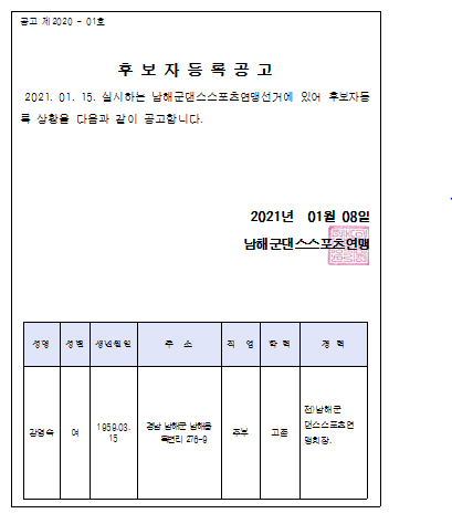 남해군 댄스스포츠연맹 회장 후보자등록 공고 페이지 정보 작성자 임혜정 댓글 0건 조회 1,994회 작성일 21-01-08 08:56 본문 남해군 댄스스포츠연맹 회장 후보자등록 공고 목록 이전글남해군 족구협회 회장 선거 후보자 등록 공고 21.01.08 다음글남해군골프협회 회장 후보자등록 공고 21.01.08 댓글목록 댓글목록 등록된 댓글이 없습니다.