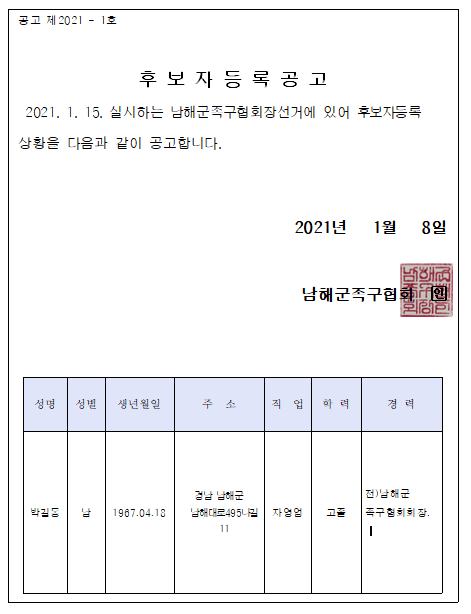 남해군 족구협회 회장 선거 후보자 등록 공고