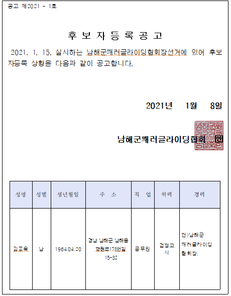 남해군 패러글라이딩협회 회장선거 후보자 공고문