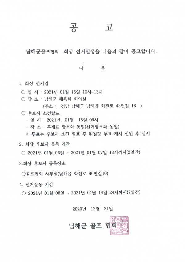 남해군 골프협회 선거공고문 페이지 정보 작성자 임혜정 댓글 0건 조회 1,882회 작성일 20-12-31 09:07 본문 남해군 골프협회 선거공고문 목록 이전글남해군족구협회 회장선거 공고문 20.12.31 다음글남해군 댄스스포츠 선거 공고문 20.12.31 댓글목록 댓글목록 등록된 댓글이 없습니다.