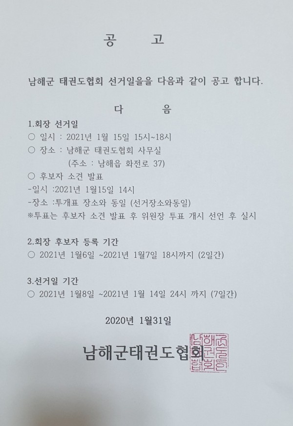 남해군 태권도협회 회장선거 공고문 페이지 정보 작성자 서윤희 댓글 0건 조회 2,046회 작성일 20-12-31 21:34 본문 남해군태권도협회 회장선거 공고문 목록 이전글남해군검도회 회장 후보 등록 공고 21.01.01 다음글남해군수영연맹 회장 당선자 공고 20.12.31 댓글목록 댓글목록 등록된 댓글이 없습니다.