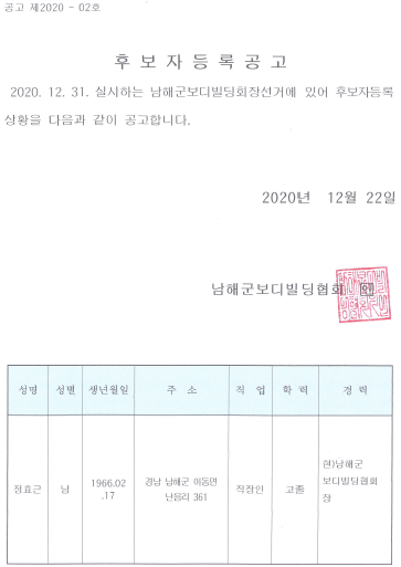 남해군 보디빌딩협회 회장선거 후보자등록