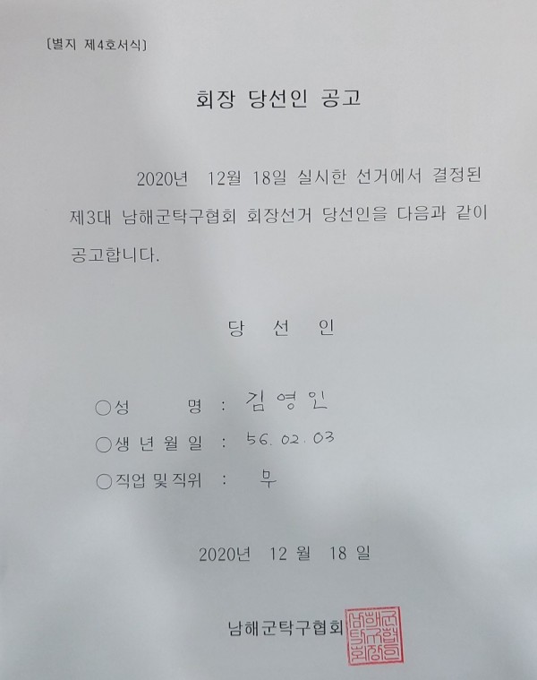 남해군탁구협회 회장선거 당선인 공고 페이지 정보 작성자 김미애 댓글 0건 조회 1,906회 작성일 20-12-21 09:26 본문 선거관리규정 제5장 제28조에 의거 당선인으로 결정하였습니다. 목록 이전글남해군야구협회회장선거공고 20.12.21 다음글남해군유도회 회장선거 공고 20.12.21 댓글목록 댓글목록 등록된 댓글이 없습니다.