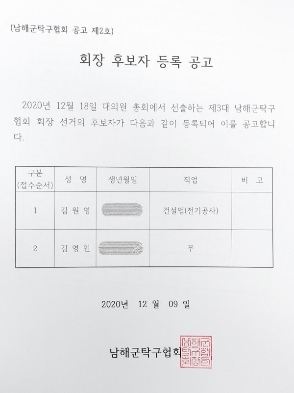 남해군탁구협회 회장 후보자 등록 공고 페이지 정보 작성자 김미애 댓글 0건 조회 1,950회 작성일 20-12-18 13:36 본문 12월8일~9일 등록기간 12월9일 공고개시 목록 이전글남해군탁구협회 선거일정 20.12.18 다음글남해군탁구협회 회장선거공고문 20.12.18 댓글목록 댓글목록 등록된 댓글이 없습니다.