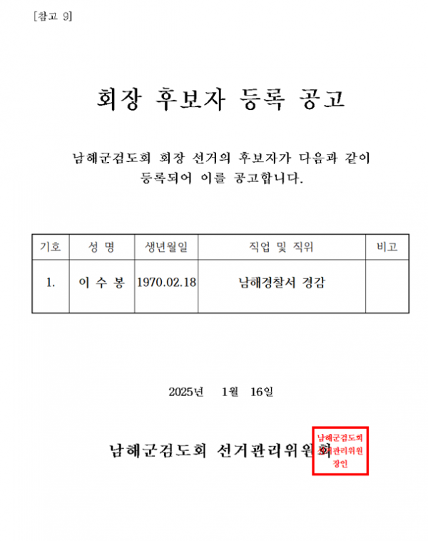 남해군검도회 회장 후보자 공고 페이지 정보 작성자 남해군체육회 댓글 0건 조회 1,377회 작성일 25-01-16 11:44 본문 남해군검도회 회장 후보자 공고 목록 이전글남해군 태권도협회 회장선거 당선인 공고 25.01.21 다음글남해군검도회 회장선거 공고 25.01.14 댓글목록 댓글목록 등록된 댓글이 없습니다.
