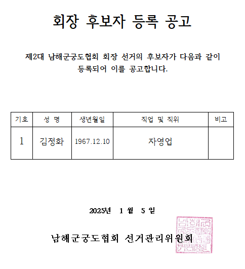 남해군궁도협회 후보자 등록공고 페이지 정보 작성자 정희진 댓글 0건 조회 1,429회 작성일 25-01-05 14:58 본문 . 목록 이전글남해군보디빌딩협회 후보자 등록공고 25.01.05 다음글남해군유도회 후보자 등록공고 25.01.05 댓글목록 댓글목록 등록된 댓글이 없습니다.
