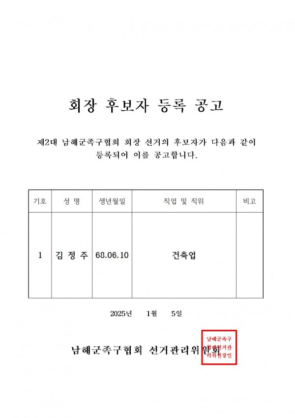 남해군족구협회 후보자 등록공고 페이지 정보 작성자 현우나배 댓글 0건 조회 1,449회 작성일 25-01-05 20:08 본문 남해군족구협회 회장선거 후보자 등록 목록 이전글남해군수영연맹 후보자 등록 공고 25.01.05 다음글남해군보디빌딩협회 후보자 등록공고 25.01.05 댓글목록 댓글목록 등록된 댓글이 없습니다.