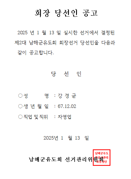 남해군유도회 회장 당선인공고 페이지 정보 작성자 남해군체육회 댓글 0건 조회 1,382회 작성일 25-01-13 13:03 본문 남해군유도회 회장 당선인공고 목록 이전글남해군야구소프트볼협회 회장 당선인공고 25.01.13 다음글남해군궁도협회 회장 당선인공고 25.01.13 댓글목록 댓글목록 등록된 댓글이 없습니다.