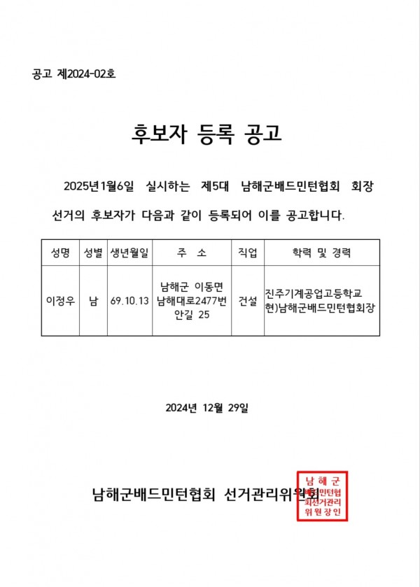 남해군배드민턴협회 후보자 등록공고 페이지 정보 작성자 한경용 댓글 0건 조회 1,497회 작성일 24-12-29 18:47 본문 남해군배드민턴협회 후보자 등록공고 목록 이전글남해군댄스스포츠연맹 선거일공고 24.12.29 다음글남해군보디빌딩협회 회장선거일정공고 24.12.29 댓글목록 댓글목록 등록된 댓글이 없습니다.