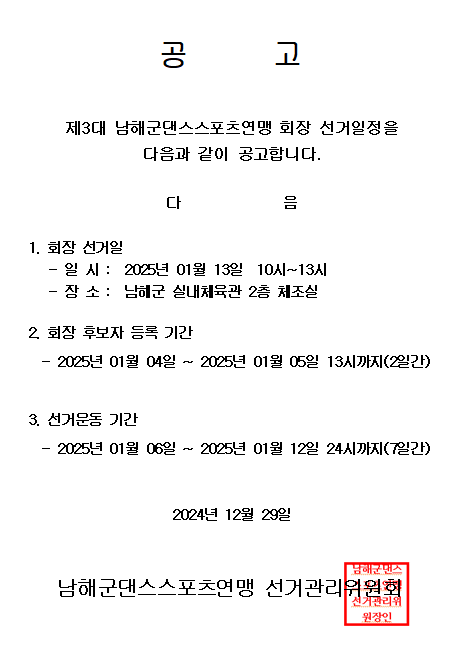 남해군댄스스포츠연맹 선거일공고 페이지 정보 작성자 남해군체육회 댓글 0건 조회 1,502회 작성일 24-12-29 18:48 본문 남해군댄스스포츠연맹 선거일공고 목록 이전글남해군탁구협회 회장 당선인 공고 24.12.29 다음글남해군배드민턴협회 후보자 등록공고 24.12.29 댓글목록 댓글목록 등록된 댓글이 없습니다.