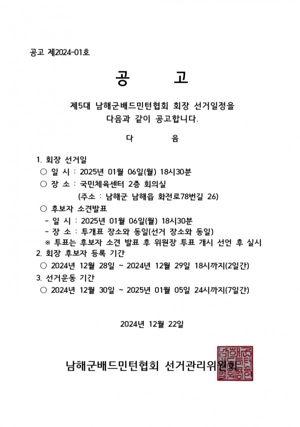 남해군배드민턴협회 회장선거일정 공고 페이지 정보 작성자 남해군체육회 댓글 0건 조회 1,633회 작성일 24-12-22 10:21 본문 남해군배드민턴협회 회장선거 일정입니다. 목록 이전글남해군파크골프협회 회장선거 일정 공고 24.12.23 다음글남해군탁구협회 후보자 등록공고 24.12.21 댓글목록 댓글목록 등록된 댓글이 없습니다.