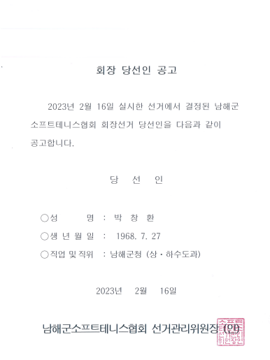 남해군소프트테니스협회 당선인 공고 페이지 정보 작성자 이동환 댓글 0건 조회 1,976회 작성일 23-02-16 13:50 본문 남해군소프트테니스협회 당선인 공고 목록 이전글남해군그라운드골프협회장선거일 공고 23.03.06 다음글남해군볼링협회 회장 당선인공고 23.02.15 댓글목록 댓글목록 등록된 댓글이 없습니다.