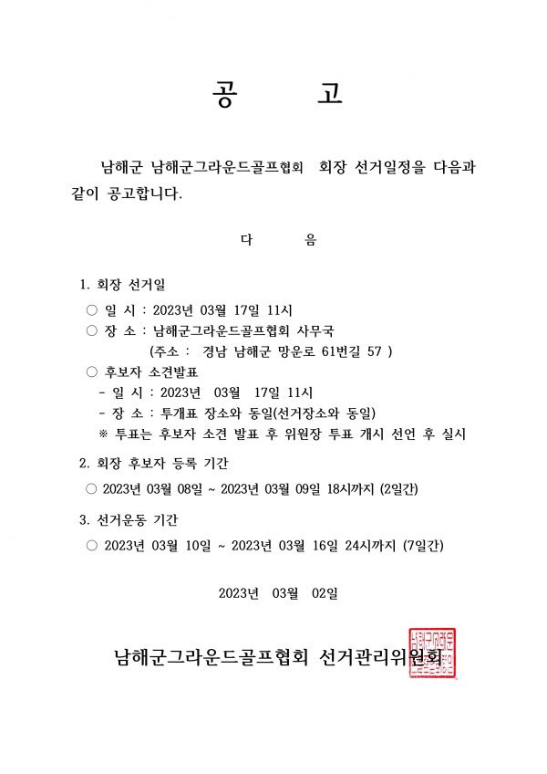 남해군그라운드골프협회장선거일 공고 페이지 정보 작성자 최경빈 댓글 0건 조회 1,979회 작성일 23-03-06 08:57 본문 남해군그라운드골프협회장 선거일 공고입니다. 목록 이전글남해군그라운드골프협회 후보자 등록공고 23.03.10 다음글남해군소프트테니스협회 당선인 공고 23.02.16 댓글목록 댓글목록 등록된 댓글이 없습니다.