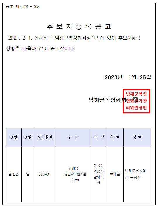 남해군복싱협회 회장 선거 후보자 등록 공고 페이지 정보 작성자 이선화 댓글 0건 조회 1,836회 작성일 23-01-25 10:21 본문 후보자 등록 공고 목록 이전글남해군 서면체육회 회장 선거 후보자 등록 공고 23.01.25 다음글남해군 궁도협회 회장선거 후보자 등록 공고 23.01.23 댓글목록 댓글목록 등록된 댓글이 없습니다.