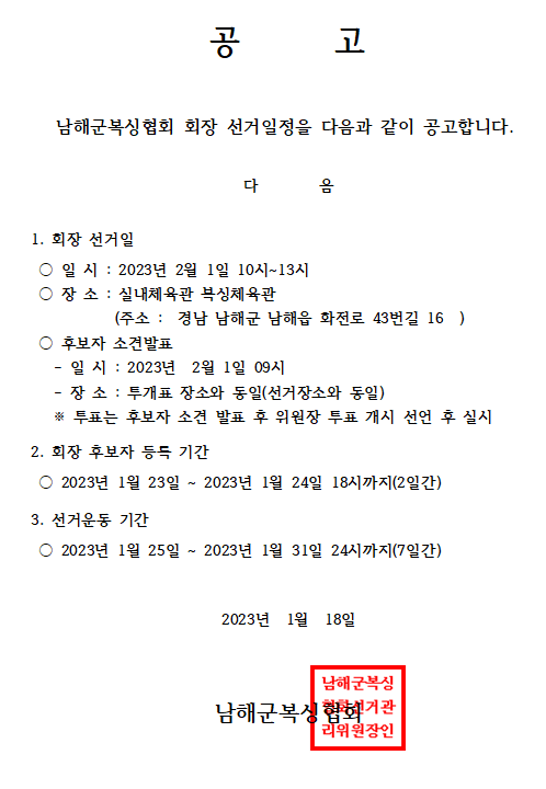 남해군복싱협회 회장선거일 공고 페이지 정보 작성자 이선화 댓글 0건 조회 1,835회 작성일 23-01-18 09:10 본문 남해군복싱협회 회장선거일 공고 목록 이전글창선면체육회 회장선거일공고 23.01.18 다음글남해군 서면체육회 회장 선거일정 공고 23.01.17 댓글목록 댓글목록 등록된 댓글이 없습니다.
