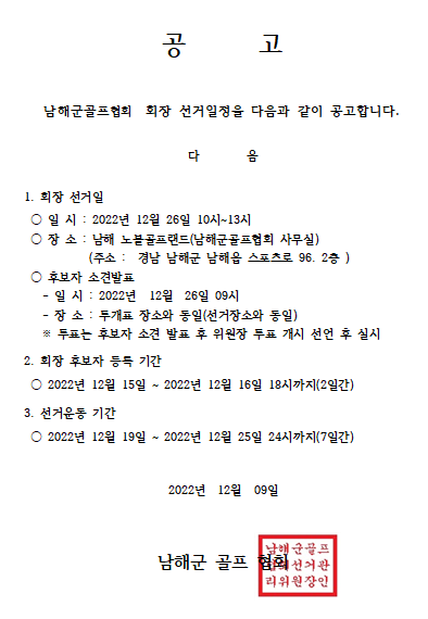 골프 협회 회장 선거 일정 공고 페이지 정보 작성자 이선화 댓글 0건 조회 1,892회 작성일 22-12-09 08:58 본문 골프 협회 회장 선거 일정 공고 목록 이전글골프협회 회장후보 등록공고 22.12.16 다음글탁구협회 회장 당선인공고 22.08.17 댓글목록 댓글목록 등록된 댓글이 없습니다.