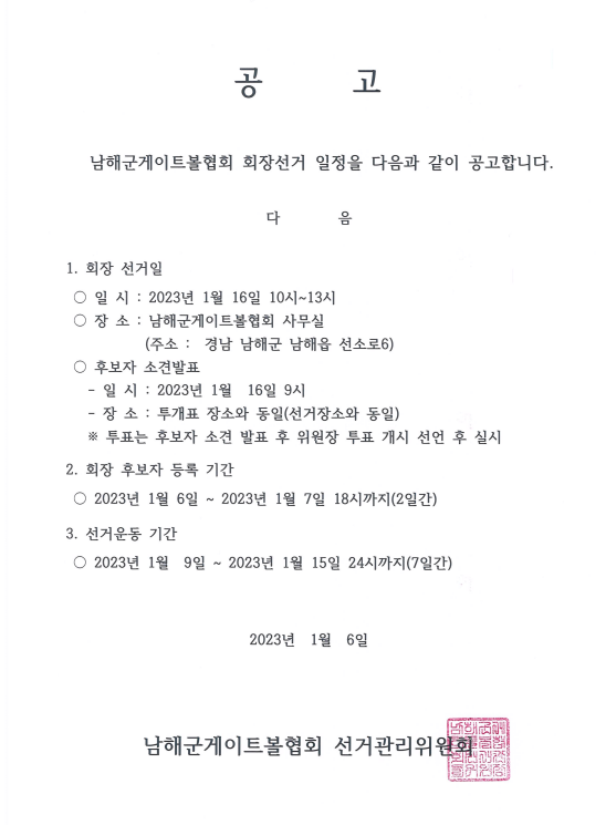 남해군게이트볼협회 회장선거 일정 공고 페이지 정보 작성자 박동선 댓글 0건 조회 1,925회 작성일 23-01-06 11:57 본문 남해군게이트볼협회 회장선거 일정 공고 목록 이전글남해군게이트볼 협회 회장선거 후보자 등록 공고 23.01.09 다음글골프협회 회장 당선인공고 22.12.26 댓글목록 댓글목록 등록된 댓글이 없습니다.