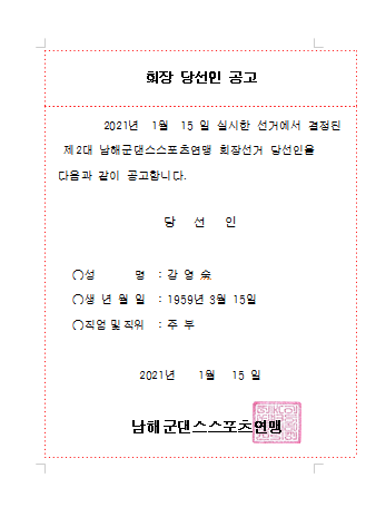 제2대 남해군 댄스스포츠연맹회장 당선인 공고 페이지 정보 작성자 임혜정 댓글 0건 조회 1,982회 작성일 21-01-15 14:31 본문 제2대 남해군 댄스스포츠연맹회장 당선인 공고 목록 이전글제8대 남해군골프협회 회장 당선인 공고 21.01.15 다음글제16대 남해군 볼링협회장 회장 당선인 공고 21.01.13 댓글목록 댓글목록 등록된 댓글이 없습니다.