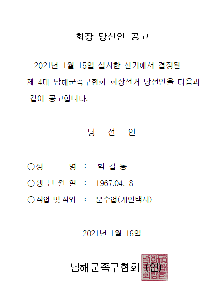 남해군 족구협회 회장 당선인 공고