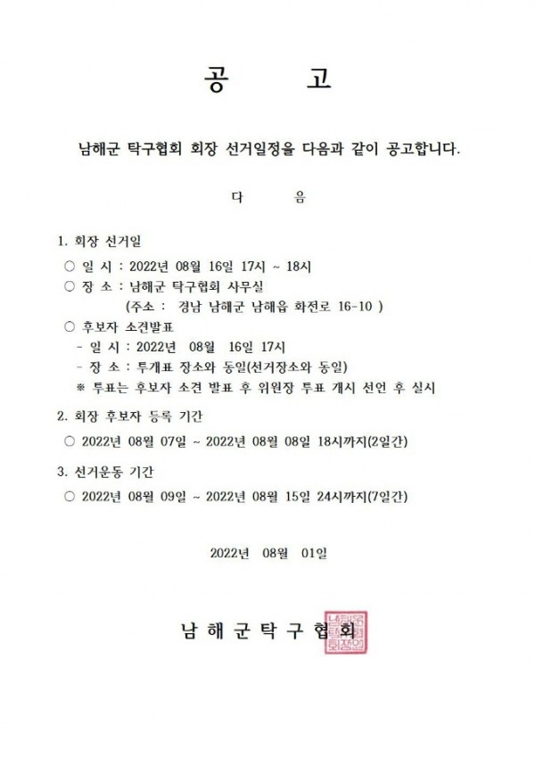 탁구협회 회장 선거일정 공고 페이지 정보 작성자 남해군체육회 댓글 0건 조회 1,968회 작성일 22-08-01 17:18 본문 탁구협회 회장 선거일정 공고 목록 이전글탁구협회 회장후보자 등록공고 22.08.09 다음글고현면체육회장 당선인 공고 22.03.15 댓글목록 댓글목록 등록된 댓글이 없습니다.
