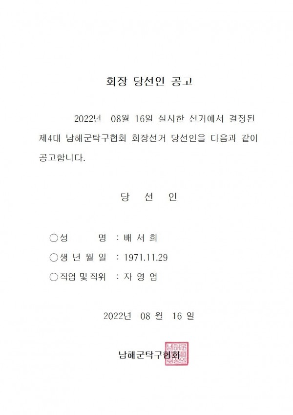 탁구협회 회장 당선인공고 페이지 정보 작성자 남해군체육회 댓글 0건 조회 1,993회 작성일 22-08-17 16:23 본문 남해군탁구협회회장 당선인공고 목록 이전글골프 협회 회장 선거 일정 공고 22.12.09 다음글탁구협회 회장후보자 등록공고 22.08.09 댓글목록 댓글목록 등록된 댓글이 없습니다.