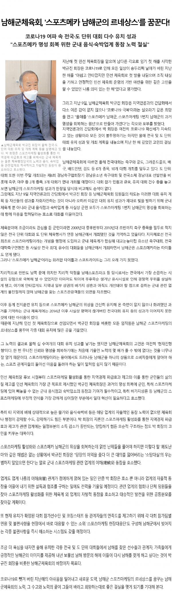 남해군체육회,'스포츠메카 남해군의 르네상스'를 꿈꾼다!_남해미래 페이지 정보 작성자 남해군체육회 댓글 0건 조회 2,717회 작성일 21-03-22 13:52 본문 ▶출처: 남해미래_정영식기자 jys23@nhmirae.com 관련링크 http://www.nhmirae.com/article.php?aid=5084761880 2126회 연결 목록 이전글남해군체육회 사단법인 설립 준비 잰걸음_남해시대 21.04.02 다음글체육회, 코로나 악재 불구 다수 전국대회 유치성과_남해시대 21.03.19 댓글목록 댓글목록 등록된 댓글이 없습니다.