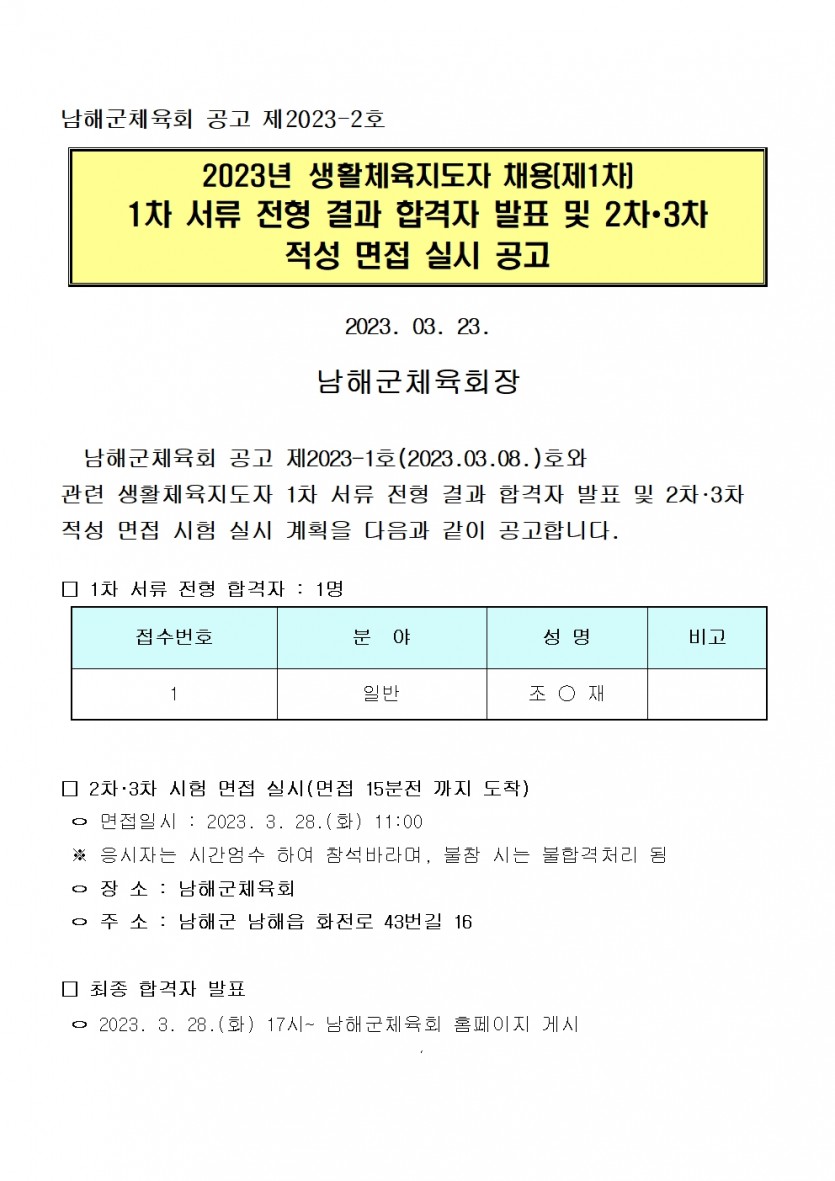2023년 생활체육지도자 채용(제1차)1차 서류 전형 결과 합격자 발표 및 2차∙3차적성 면접 실시 공고합니다.