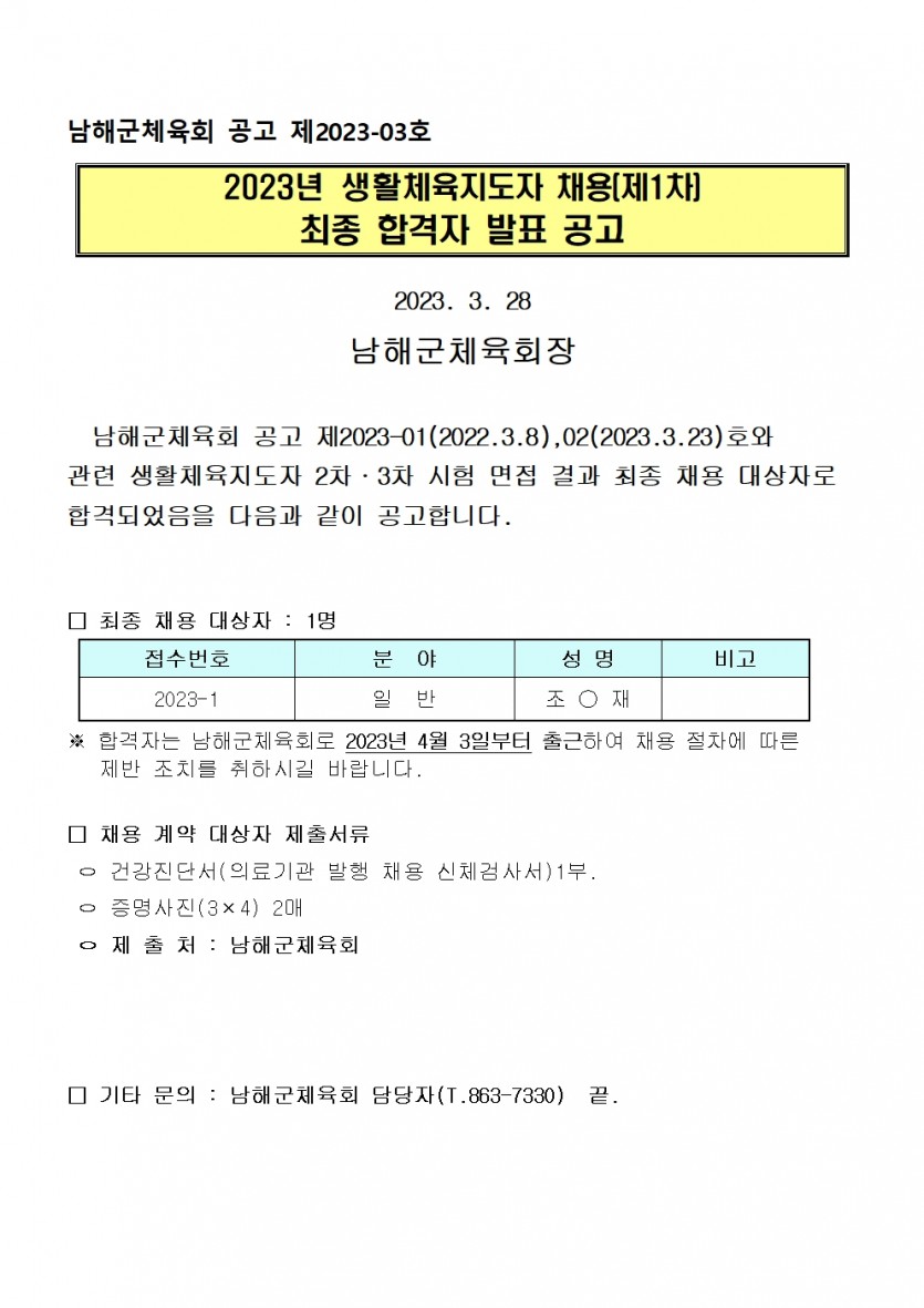 2023년 남해군생활체육지도자(제1차) 최종 합격자 발표