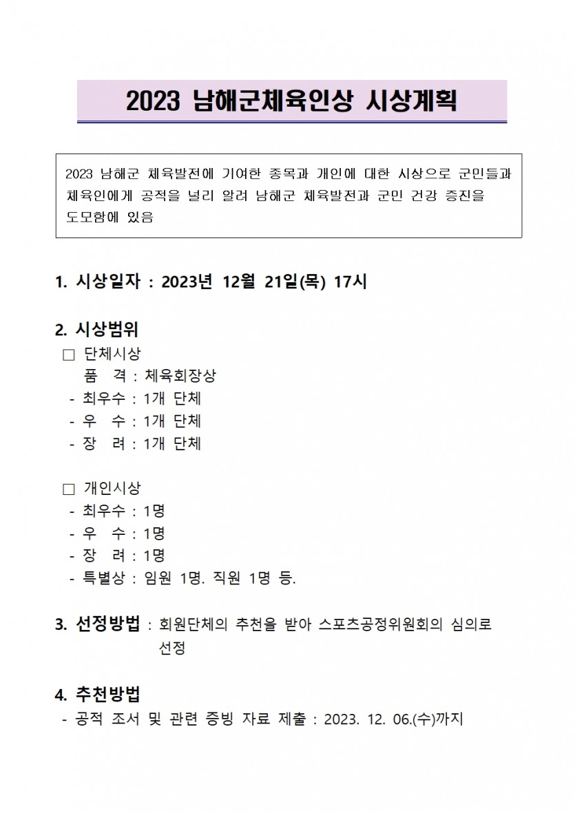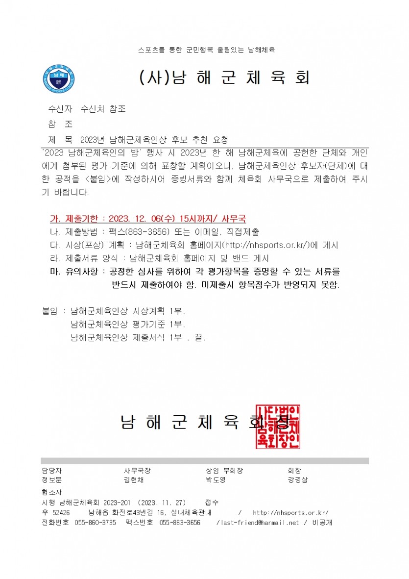 ▣ 2023년 남해군체육인상 후보자 추천 안내