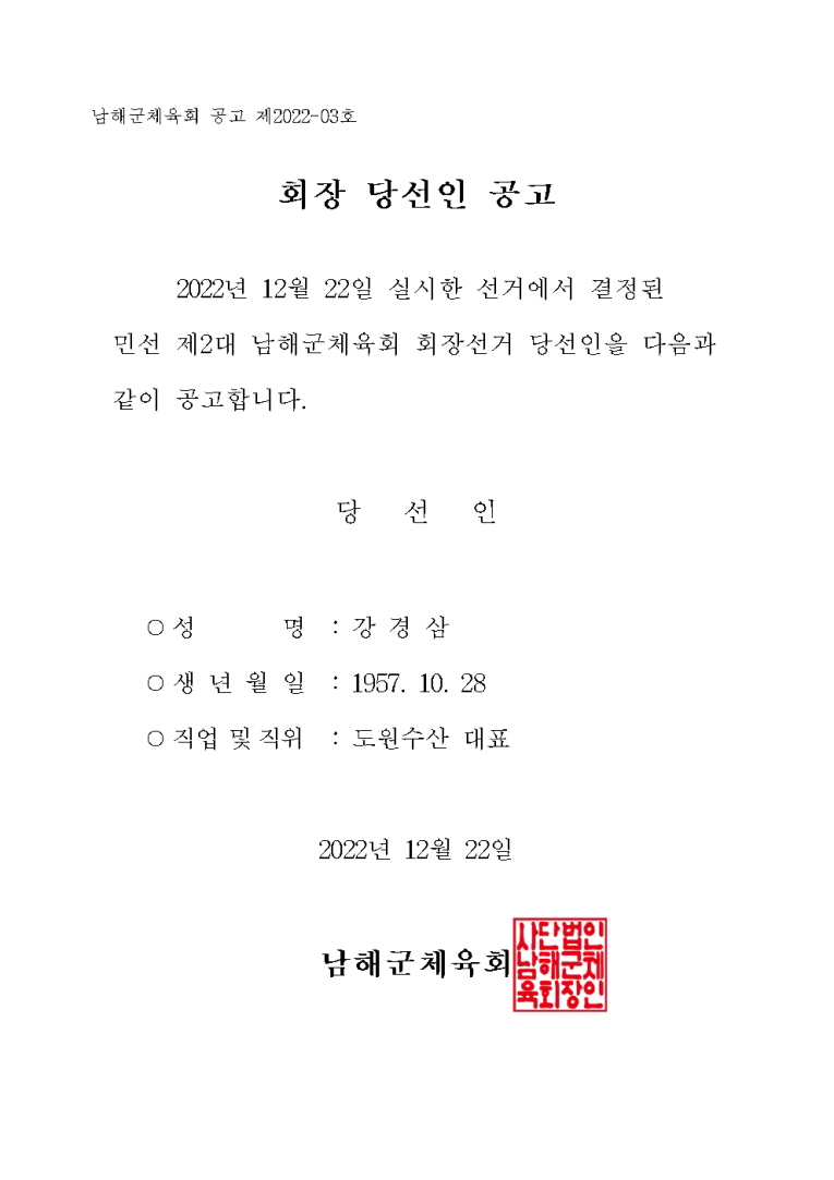 민선 제2대 남해군체육회장 선거 후보 등록 결과(2022.12.12), 후보자 1인이 등록되어 남해군체육회장 선거관리규정 제38조(당선인결정)제2항에 의거 투표가 실시되지 않습니다.
