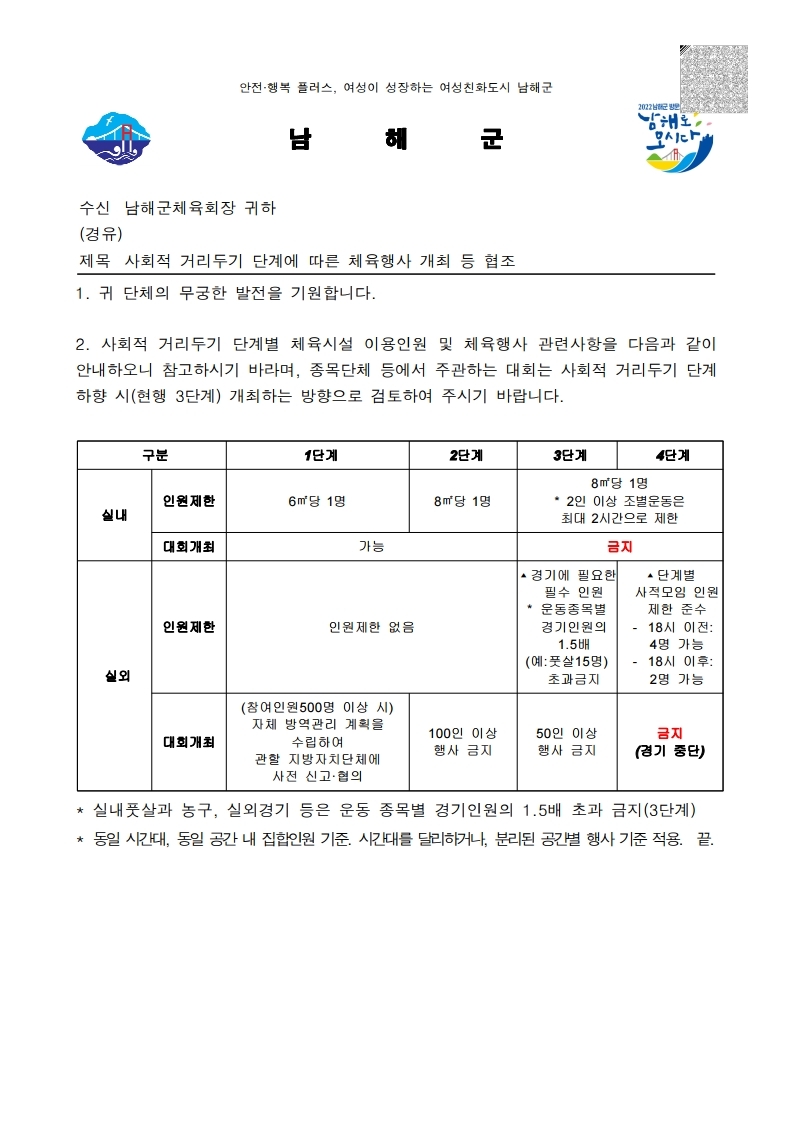 사회적거리두기 3단계에 따른 공공체육시설 사용 안내