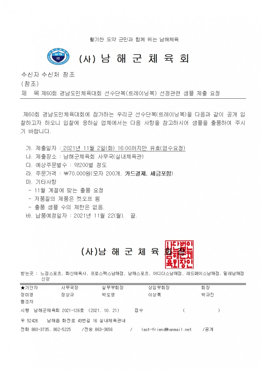 제60회 경상남도민체육대회 선수단복 공개 입찰 공지 페이지 정보 작성자 남해군체육회 댓글 0건 조회 1,861회 작성일 21-10-21 15:09 본문 제60회 경상남도민체육대회 선수단복 선정을 위한 공개 입찰을 안내드립니다. 목록 이전글2021 남해군체육인상 후보 추천 요청 21.12.08 다음글사회적 거리두기 3단계 연장에 따른 체육행사 방역 지침 안내(10.18일 새 지침) 21.10.05 댓글목록 댓글목록 등록된 댓글이 없습니다.