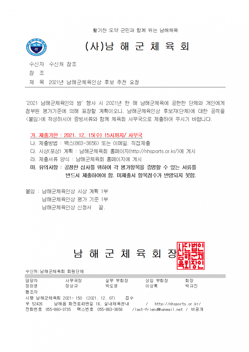 2021년 한 해 남해군체육발전에 공헌한 단체와 개인의 공로에 감사드리고 합니다. 많은 추천 바랍니다.