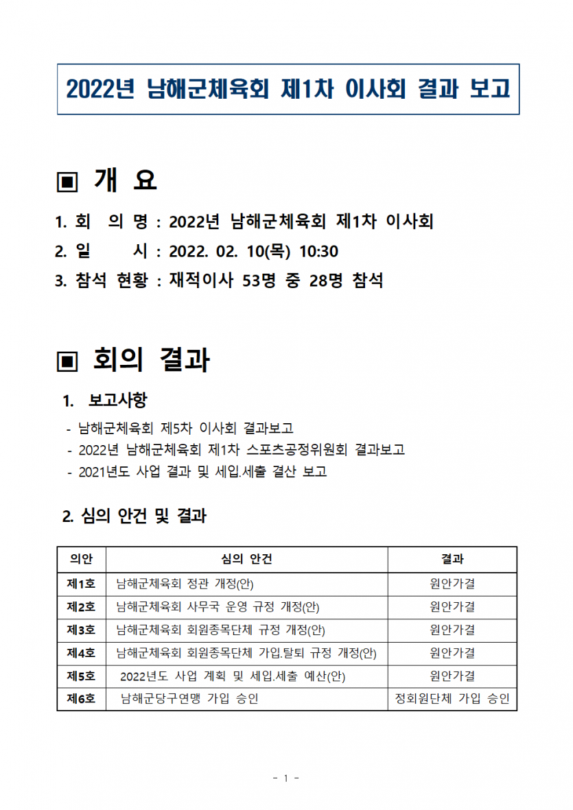 2022년 남해군체육회 제1차 이사회 결과 페이지 정보 작성자 남해군체육회 댓글 0건 조회 1,743회 작성일 22-02-10 19:42 본문 2022년 남해군체육회 제1차 이사회 결과입니다. 목록 이전글2022년도 남해군체육회 정기총회 결과 22.02.11 다음글2022년 남해군체육회 제1차 스포츠공정위원회 회의 결과 22.02.10 댓글목록 댓글목록 등록된 댓글이 없습니다.