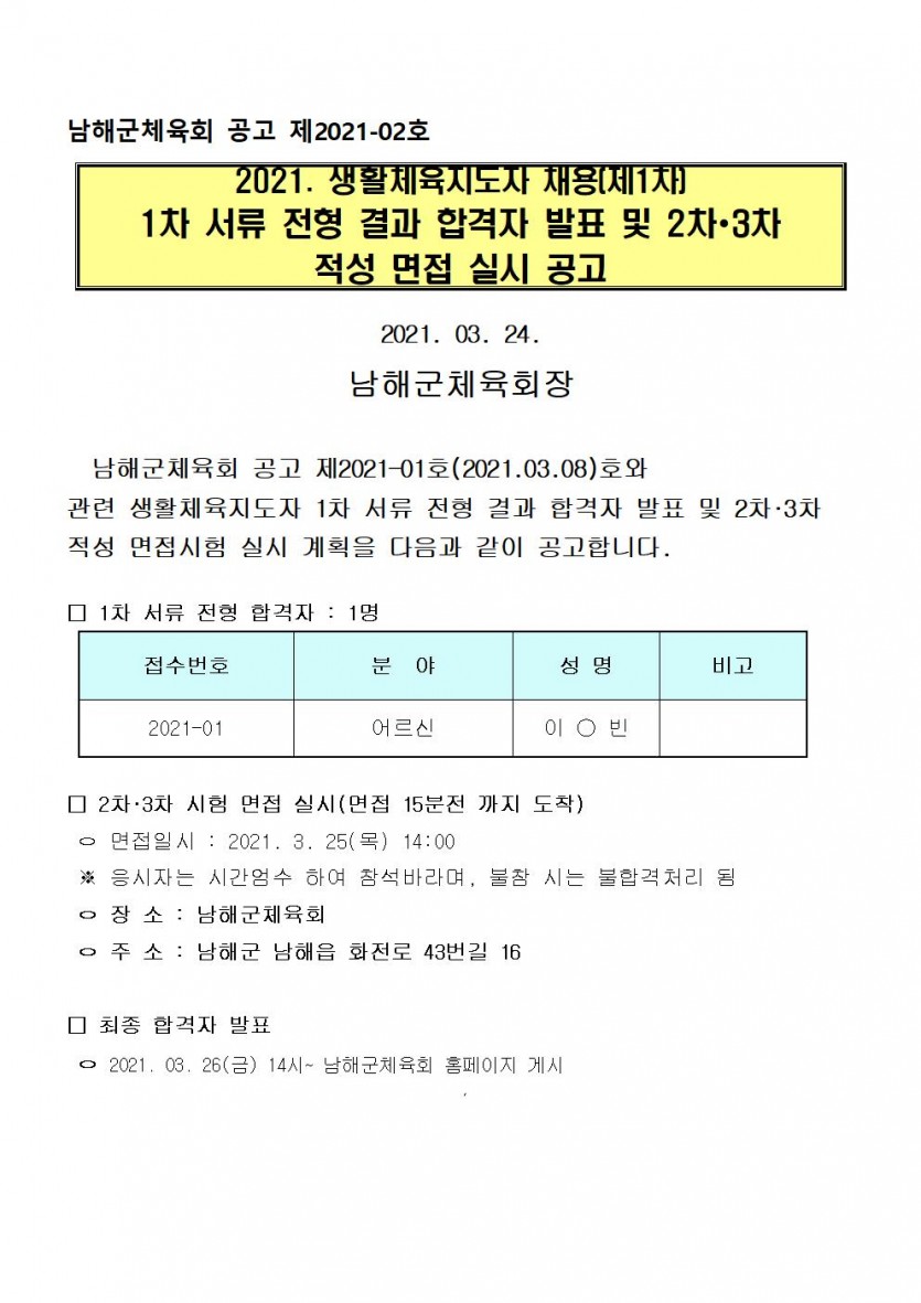 2021 생활체육지도자 채용(제1차) 1차 서류 전형 결과 합격자 발표 및 2차∙3차 적성 면접 실시 공고 페이지 정보 작성자 남해군체육회 댓글 0건 조회 1,920회 작성일 21-03-24 09:14 본문 남해군체육회 생활체육지도자 모집에 따른 제1차 서류전형 합격자 발표 및 2.3차 면접심사 실시 공고를 합니다. 목록 이전글2021년 생활체육지도자 채용(제1차) 최종 합격자 발표 21.03.26 다음글2021년 신나는 주말체육학교(학교밖)프로그램 참가자 모집 21.03.12 댓글목록 댓글목록 등록된 댓글이 없습니다.