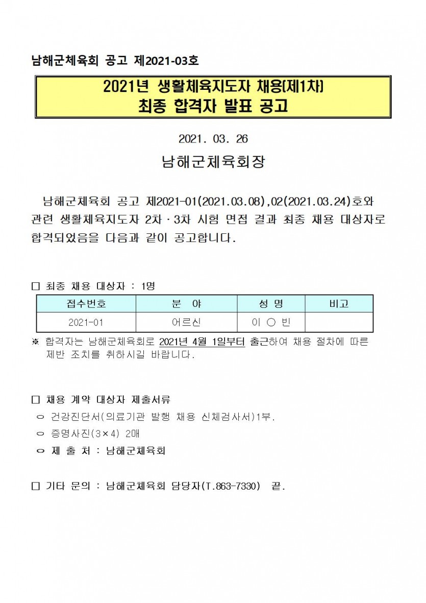 2021년 생활체육지도자 채용(제1차) 최종 합격자 발표