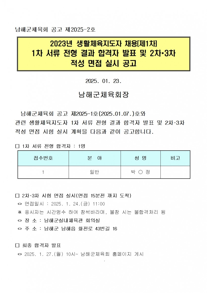 남해군체육회 공고 제2025-1호(2025.1.7)호와 관련 생활체육지도자 1차 서류 전형결과 합격자 발표 및 2차.3차 적성 면접 시험 실시 계획을 공고 합니다.
