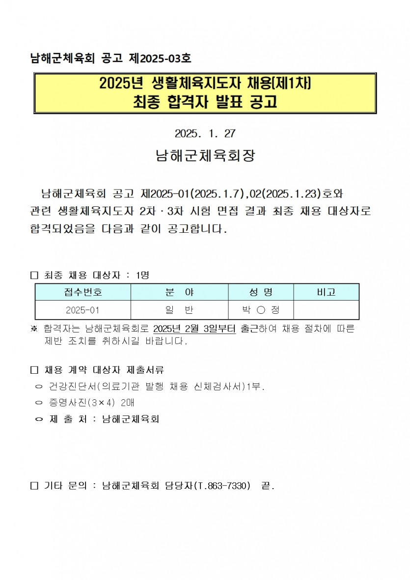2025년 남해군체육회 1차 채용 최종 합격자 발표 공고