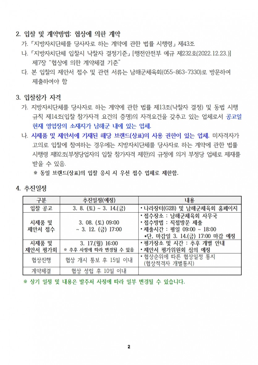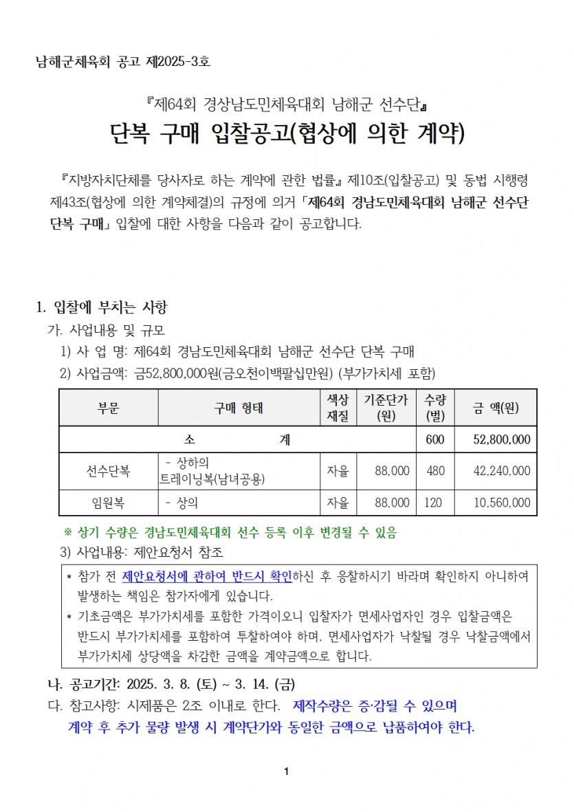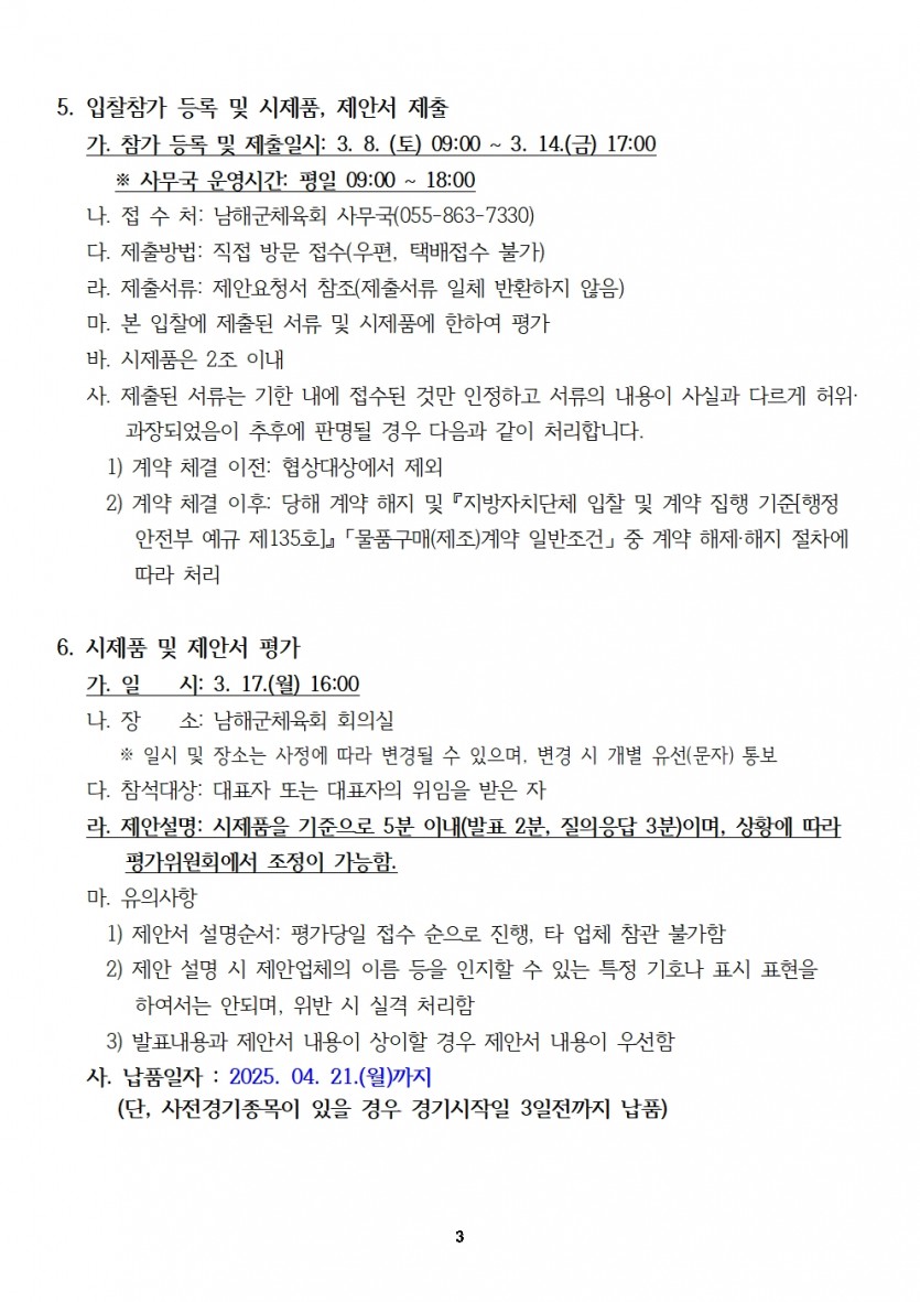 - 남해군체육회제64회 경상남도민체육대회 입찰 제안요청서 1.hwp (107.0K) 22회 다운로드 | DATE : 2025-03-10 17:24:19