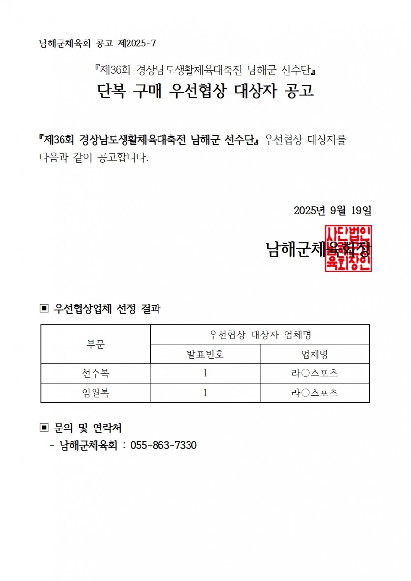 제36회 경상남도생활체육대축전 남해군 선수단 단복 구매 우선협상 대상자 공고 페이지 정보 작성자 남해군체육회 댓글 0건 조회 752회 작성일 25-09-19 10:44 본문 남해군체육회 공고 제2025-7에 의거 목록 이전글2025년 남해군체육인상 후보자 추천 안내 25.11.25 다음글제36회 경상남도생활체육대축전 남해군선수단 단복 구매 입찰공고(협상에 의한 계약) 25.09.09 댓글목록 댓글목록 등록된 댓글이 없습니다.