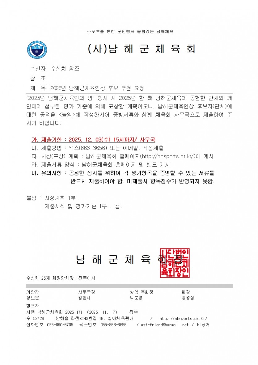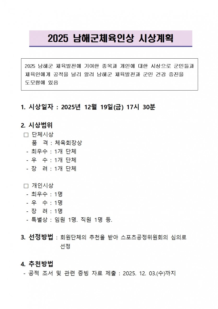 2025년 남해군체육인상 후보자 추천 안내입니다.