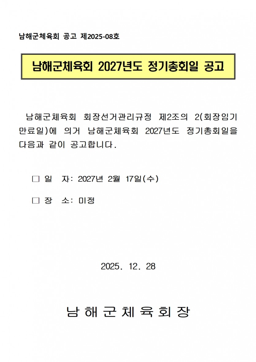남해군체육회 2027년도 정기총회일 공고