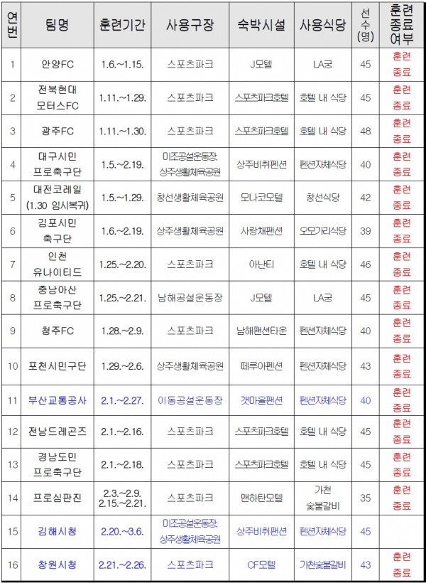 이달(3월)까지 총 16팀이 남해군을 방문하여 동계훈련을 진행하였습니다.